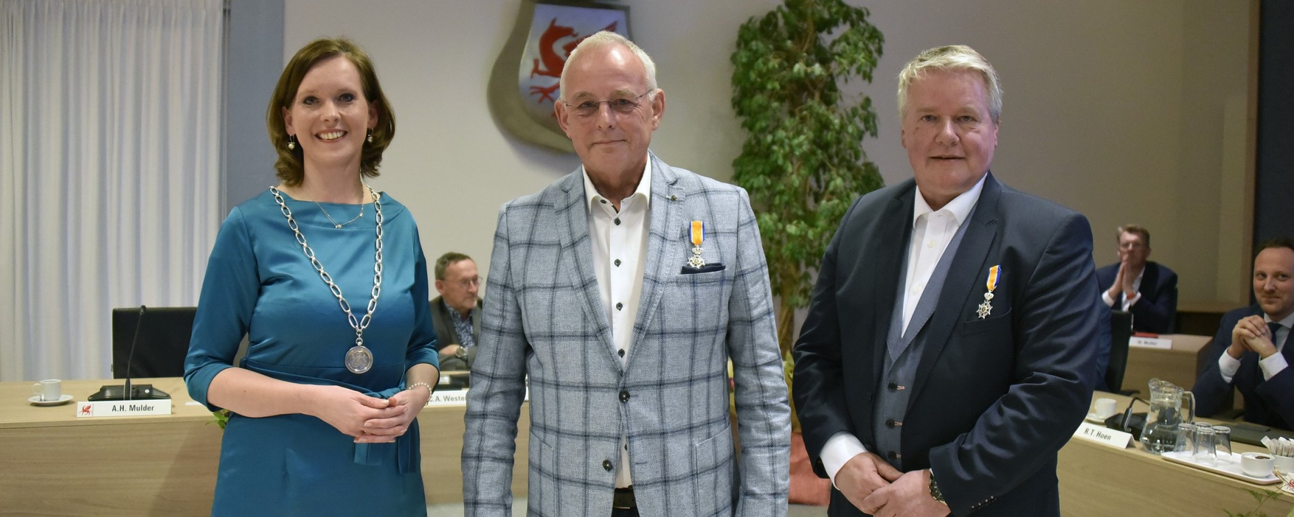 Burgemeester Stieneke van der Graaf reikte tijdens deze bijzondere raadsvergadering aan twee raadsleden een Koninklijke Onderscheiding uit: J. (Hans) Visser (CDA) en E. (Ed) de Vries (VVD). Beiden hebben zich jarenlang met grote toewijding ingezet voor de lokale democratie en de gemeenschap.