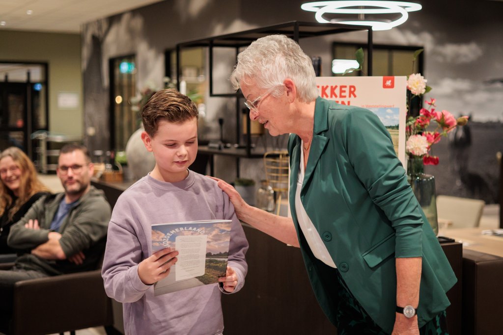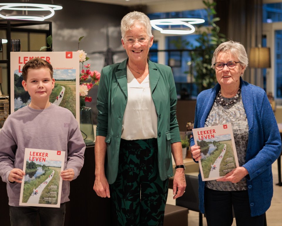 Wethouder Hanneke Zonderland overhandigt de eerste exemplaren van het magazine Lekker leven in Weststellingwerf aan de Roelie (82) en Pim (11): de oudste en jongste die een bijdrage leverden aan dit magazine.